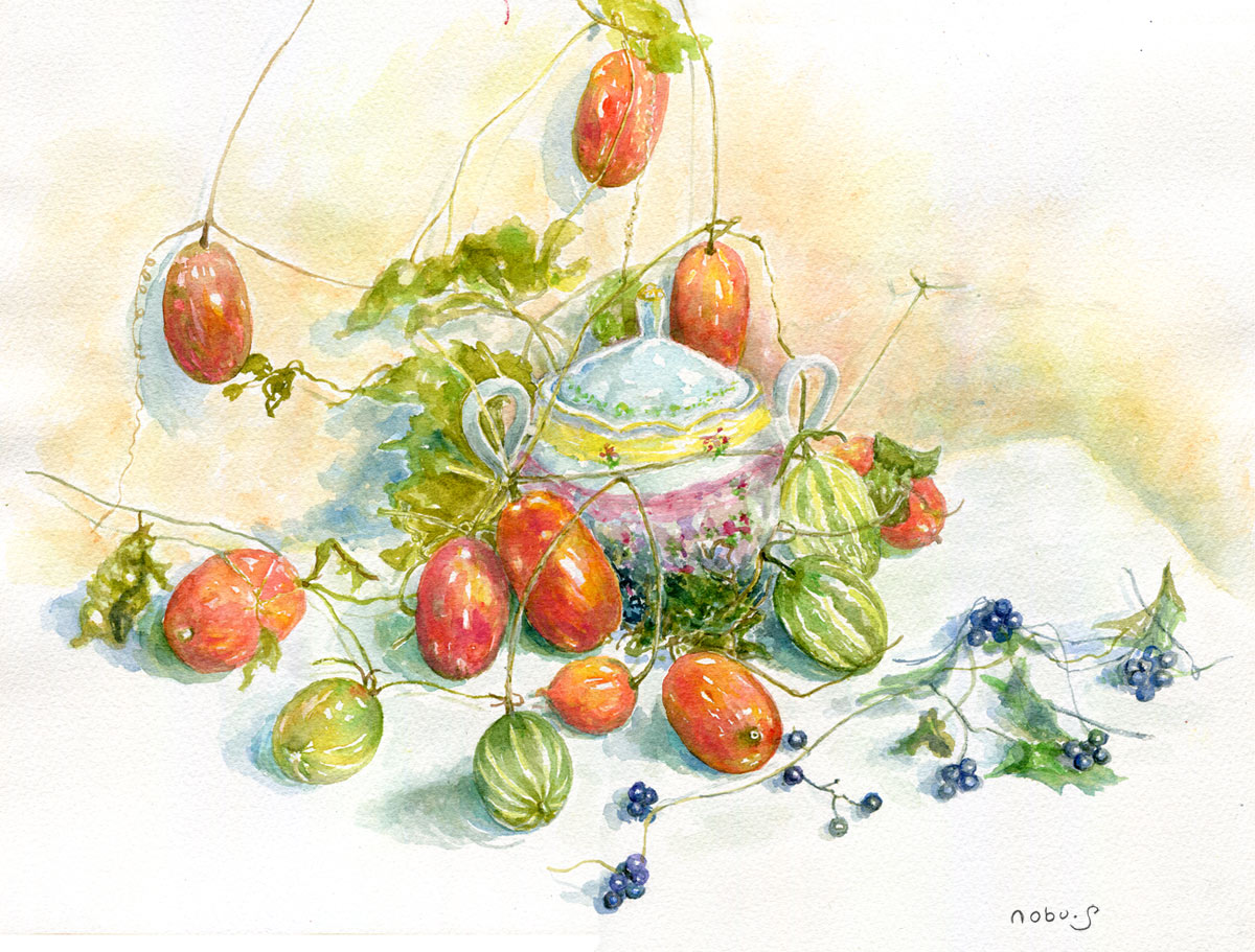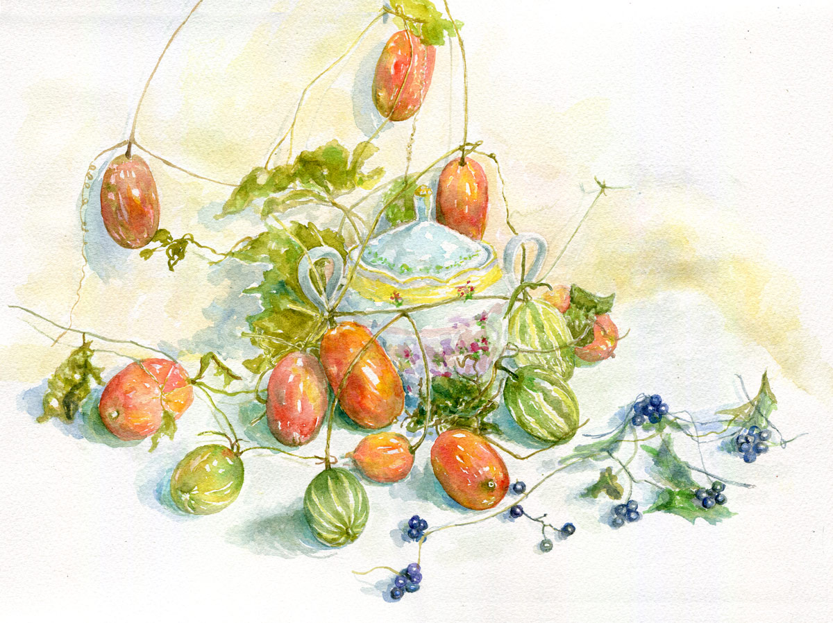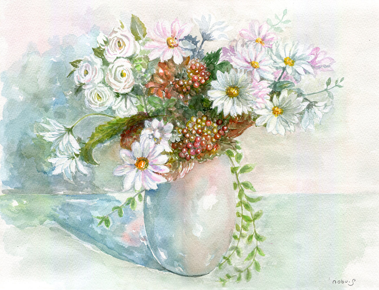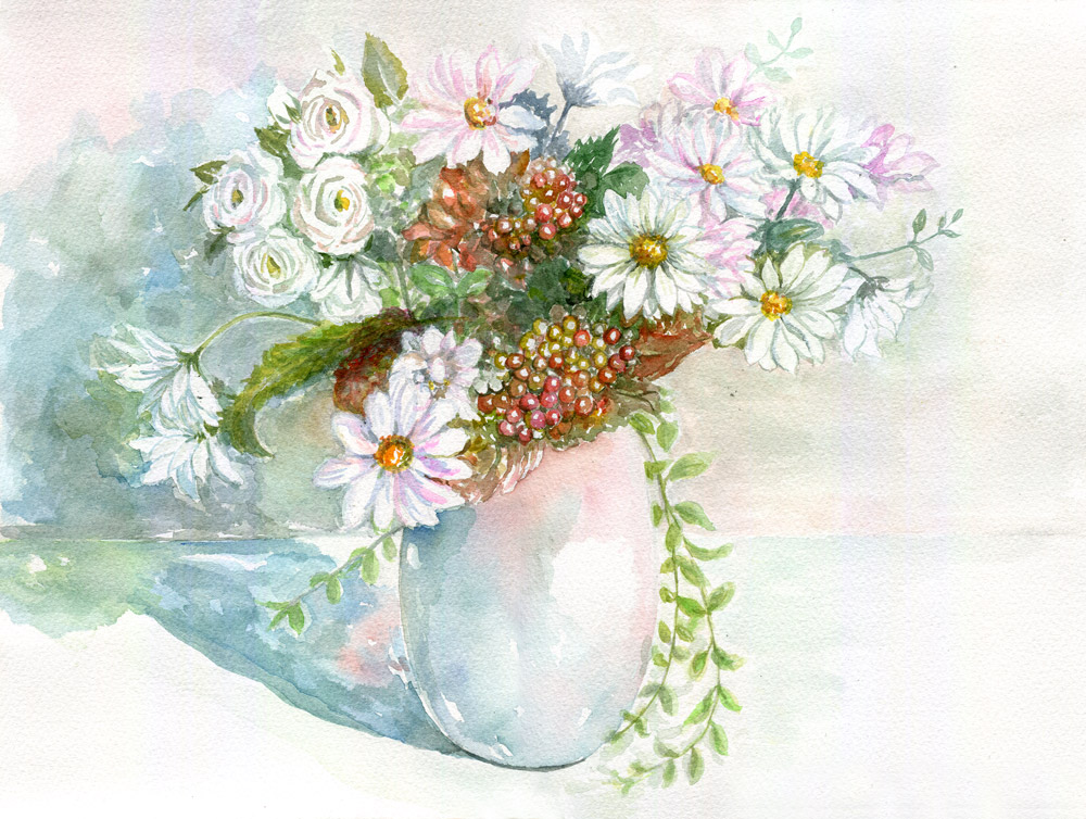 とりあえず我が家は無事でした〜^_^; 夜中の1番強い風が吹いてる時はウワァ〜と風が押し寄せるような感じで雨戸の音は激しいし部屋はギシギシするしどうなることかと>_< 眠るに眠れないので中二階の部屋で絵を描いていたら主人と息子が時々部屋に来て屋根が飛んだらどうしようとか最悪の事ばかり言うので無視して絵を描いているとこんな状況でよく絵なんて描いていられると… 私だって本当は怖いけどどうにもならないんだから何かに集中している方が楽なのに〜結局あまり寝られなかったので宿題の絵はほとんど完成しました!ヤッター 細かくて全然やる気がでなくて困っていたので台風のおかげかもなんて言ったら叱られちゃいますね>* ))))>< 今日は気温がドンドン上がって来てメッチャ暑くて参りますね(-。-;でも今日はこれからテニスがあるので出かけます!いきなりの暑さなので熱中症予防のドリンク持って行きます(^_^)vではでは皆さんも気を付けて〜 [デージーと秋の実]水彩画 |