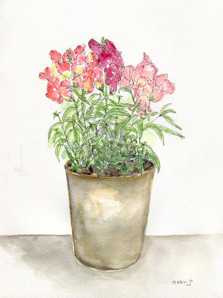 今日はお絵描き会だったので朝から準備に大忙しε=ε=(ノ^0^)ノガンバァ☆☆ 昨日のうちに掃除はしておいたのにもたもたしていたのですぐに時間になってしまい慌てて庭に出て花を摘んでテーブルに飾ったらメンバーがやって来ましたε= (・c_,・。A)フウー 最近なんだかペースが上がらなくて時間ばかりかかります;困ったものです>_< 今日は一人が風邪で欠席したけど三人来てくれました☆(人´ω`*)ぅ。れ。し。ぃ。。 今日の題材は金魚草と数珠珊瑚にガラスの花瓶。 可愛い花だけど意外に難しいのでデッサンに時間がかかってしまい終わったのが四時過ぎ、それから今日はおばあちゃんのお店に友達と行くことになっていたので大急ぎで支度して行ってきました 今日は金曜日ということもあって六時前に着いたのにもうすでにいっぱい。 少し外で待っていたら家族連れのお客さんが帰ったので四人ちょっと無理やりだったけど中に入れました(○´д`人´д`○)ュルシテネ 今日も常連さんやら知らないお客さんと意気投合!だいぶ喋ったけどまだまだ話し足りない仲間がもう一軒行こうよってなりまたちょこっと飲んだらすっかり酔っ払って帰って来ました(~_~;) この絵は帰ってからペンでさらっと描きました。+゚:.d(◎′∀`)bヨロシク.:゚+。 |