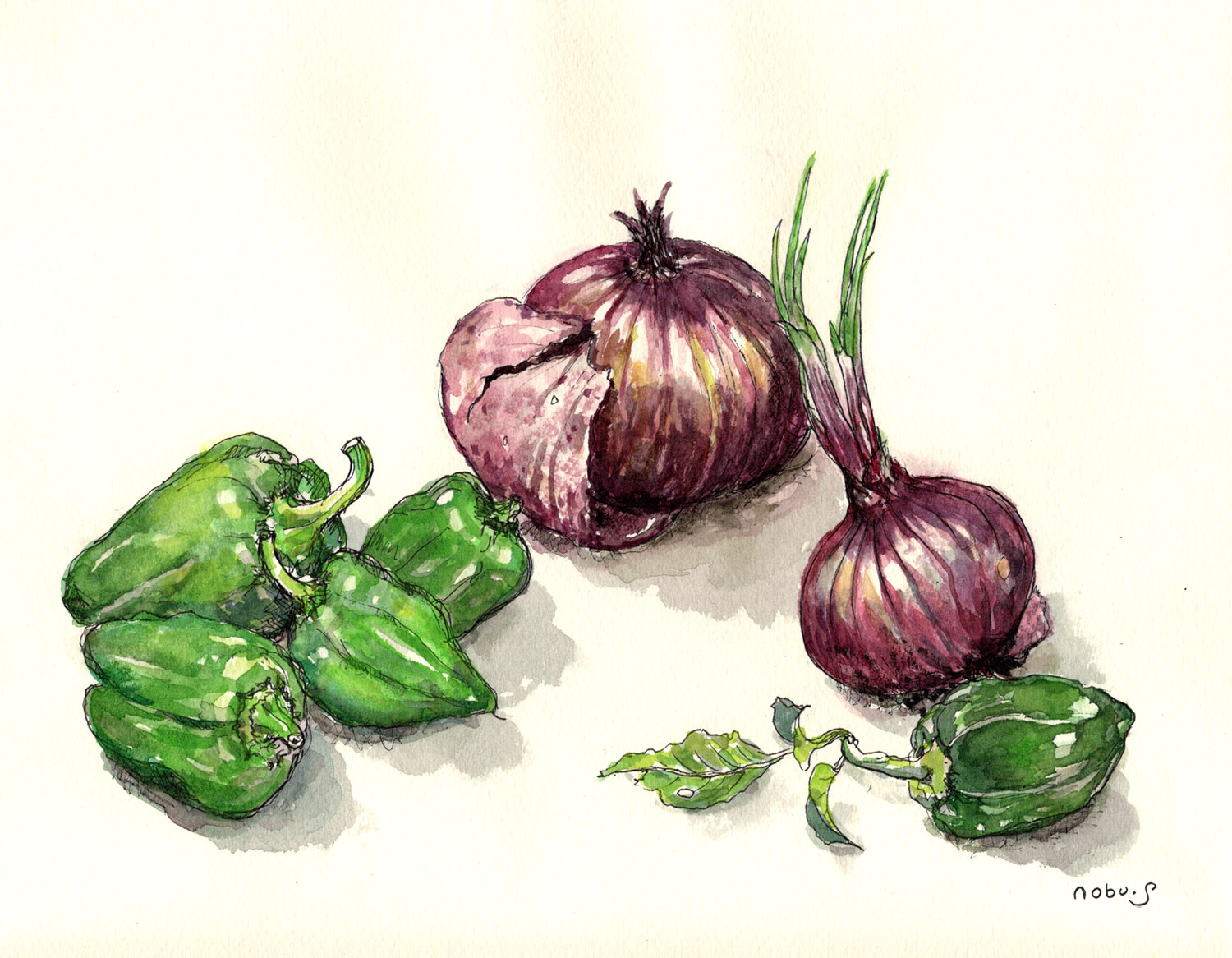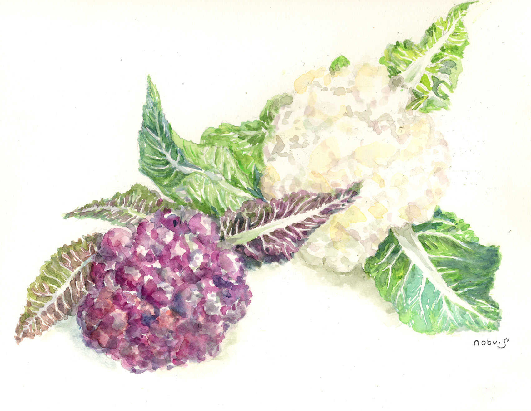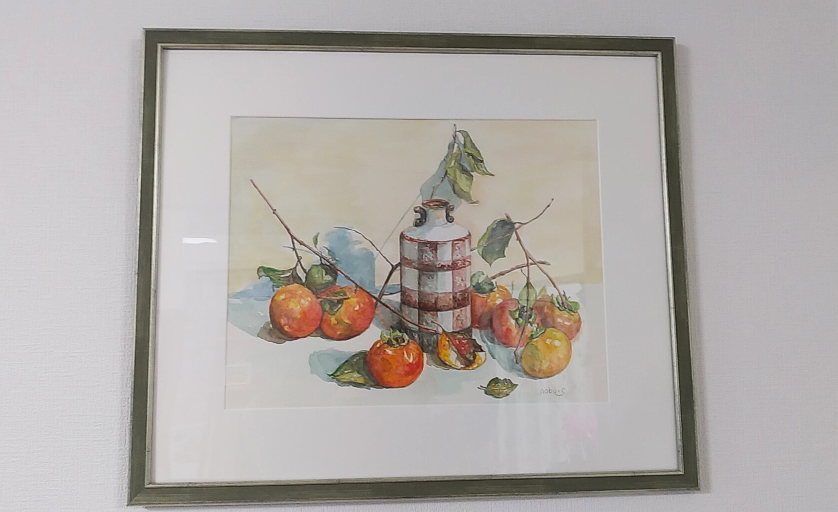 この絵はお友達が枝付きの柿を持って来てくれたので描いてみました。