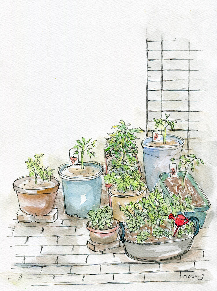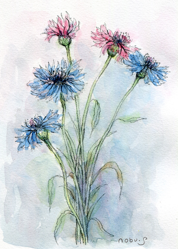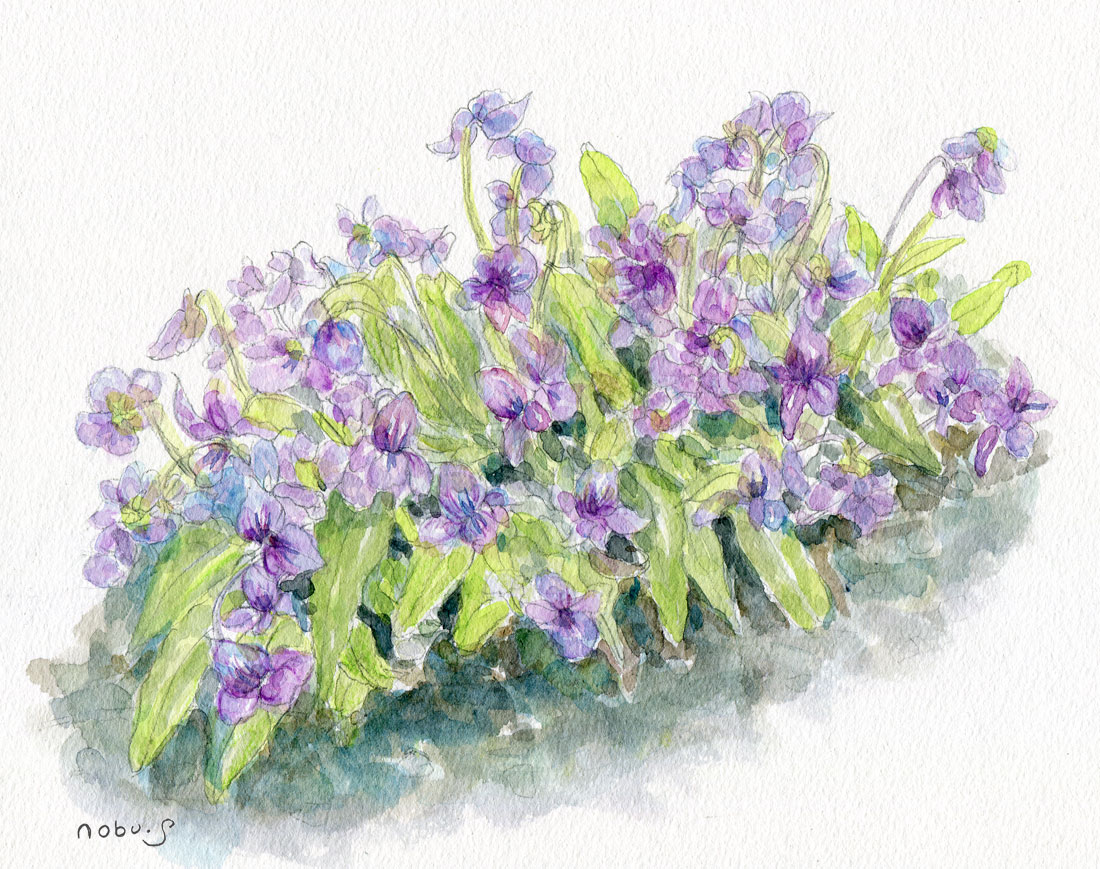 今日の絵はスミレです。フワリと散歩した時に裏の駐車場に咲いていたのを見つけたので写真を撮って描きました。ほんの少しの隙間にギッシリと咲いていて野生の花の強さを感じました(^_^)v [スミレ]水彩画 |