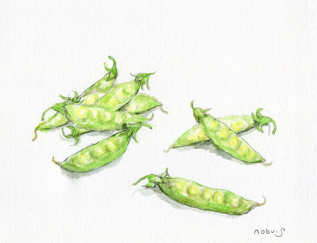 今日はこれから今川公園のテニスに行って来ます!汗かきそう(^。^)ではまた~~~ [採りたて絹さや]水彩画 |
