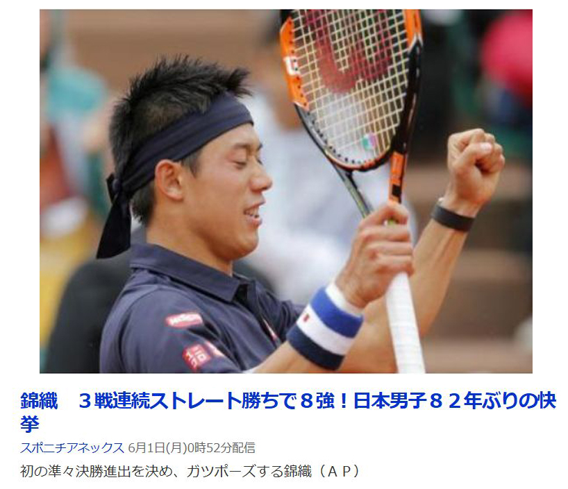 今日はこれから錦織くんの試合が始まります。 準々決勝です。相手はフランスのツォンガ、 今までの試合より厳しいものになると思うけどいつものプレイが出来ればきっと勝てると思います。ローランギャロスはフランスの選手に大声援だからTVの前で負けないように応援するぞ〜