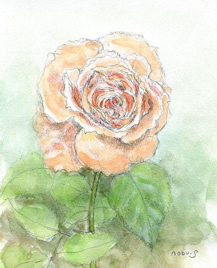 紫陽花が色付いて来ると薔薇の花もいったん終わります 白いツル薔薇、赤と黄色の薔薇とこのアプリコットが春からよく咲いて楽しませてくれました。 黒いラインを生かしていつもと違った感じで描きましたm(._.)m 何回描いても難しいです~_~;