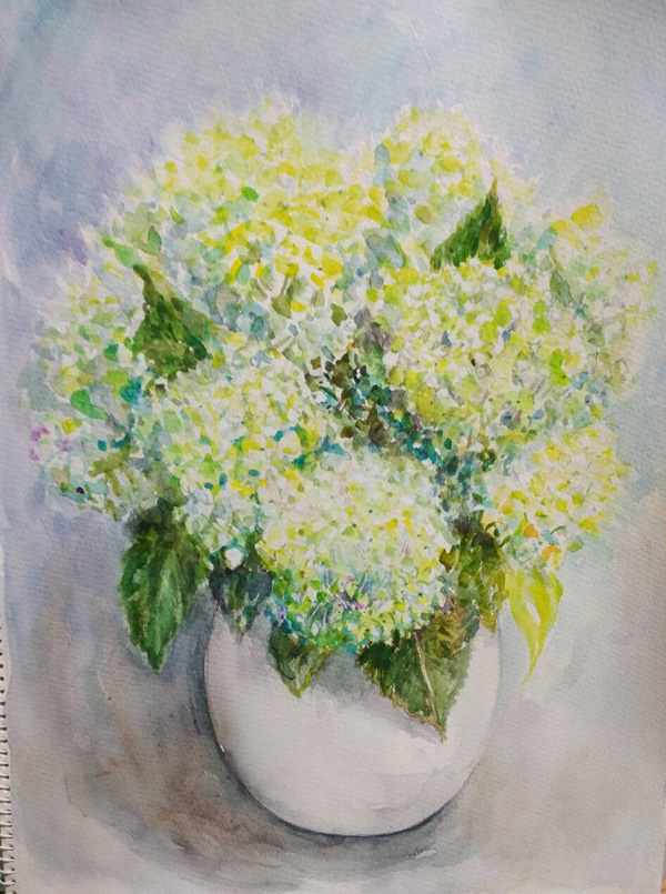 この花はアナベルという紫陽花の種類で、最近よくみかけると思います。 とても小さい花なので一つ一つ描くのは無理なので雰囲気で描きまし た。 これを機に少しずつですが描いてみようかな〜なんて思っています。