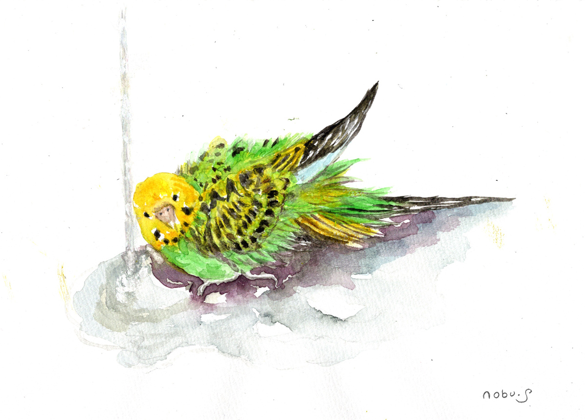 ピーちゃんが水浴びしてる絵です。羽を広げているので、普通に止まっているピーちゃんより難しいです(^o^;)