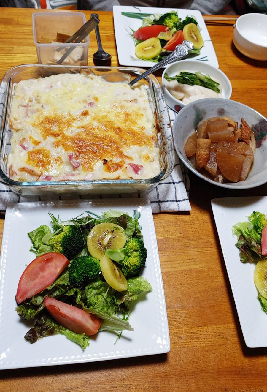 今日のランチはポテトグラタンとサラダと昨日作った煮物です。