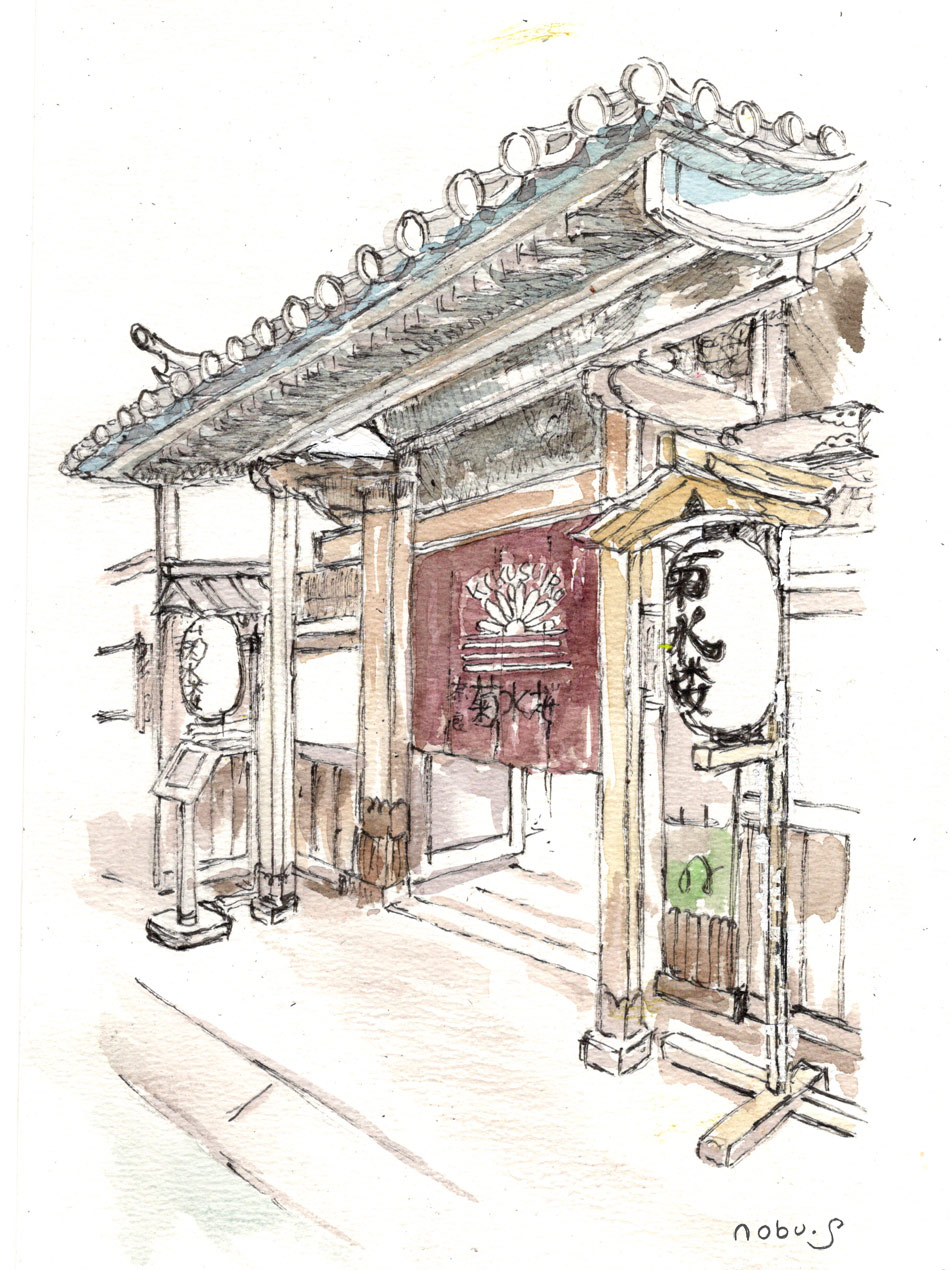 菊水楼入口の門 (ペン画水彩)
