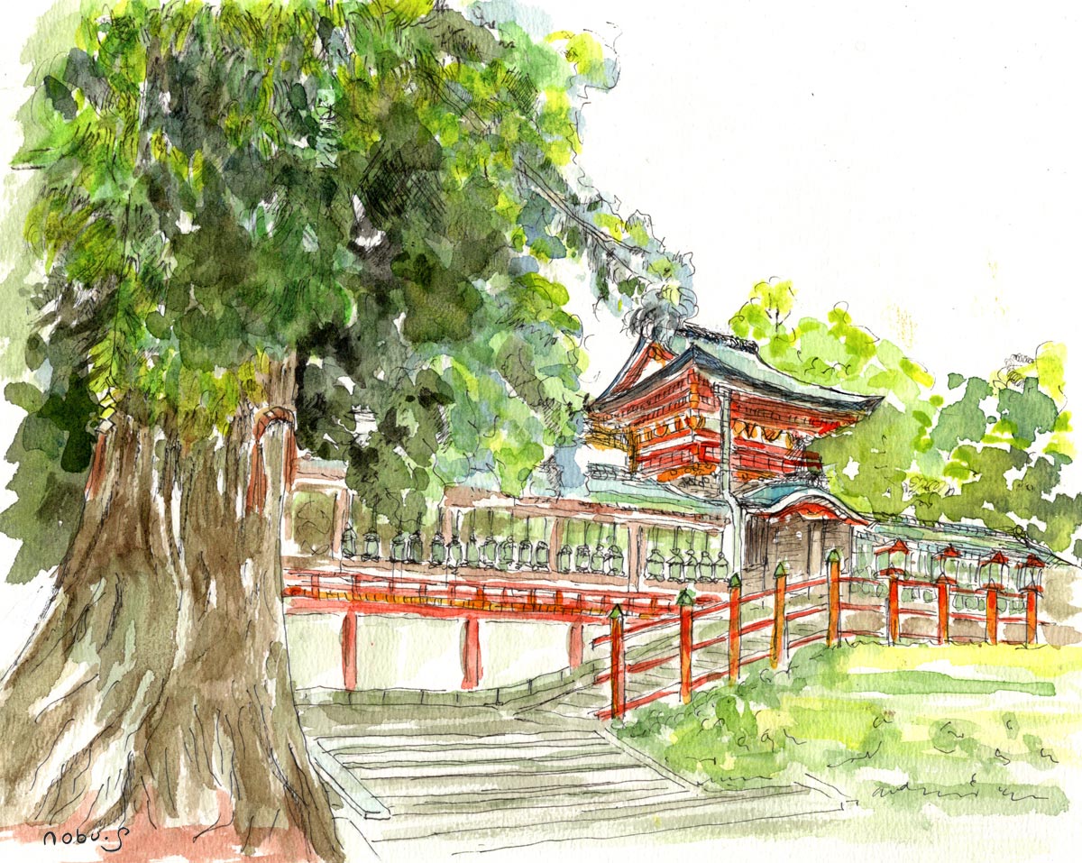 春日大社の中庭から見た本殿(ペン画水彩)