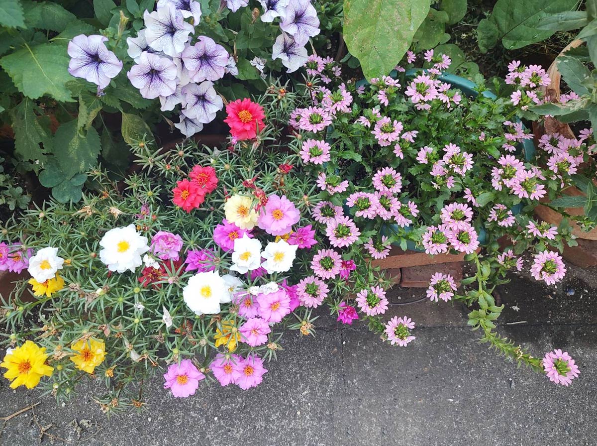 この写真の花は暑さに負けずに咲いてくれています。スカエボラと大輪松葉牡丹とペチュニアです。