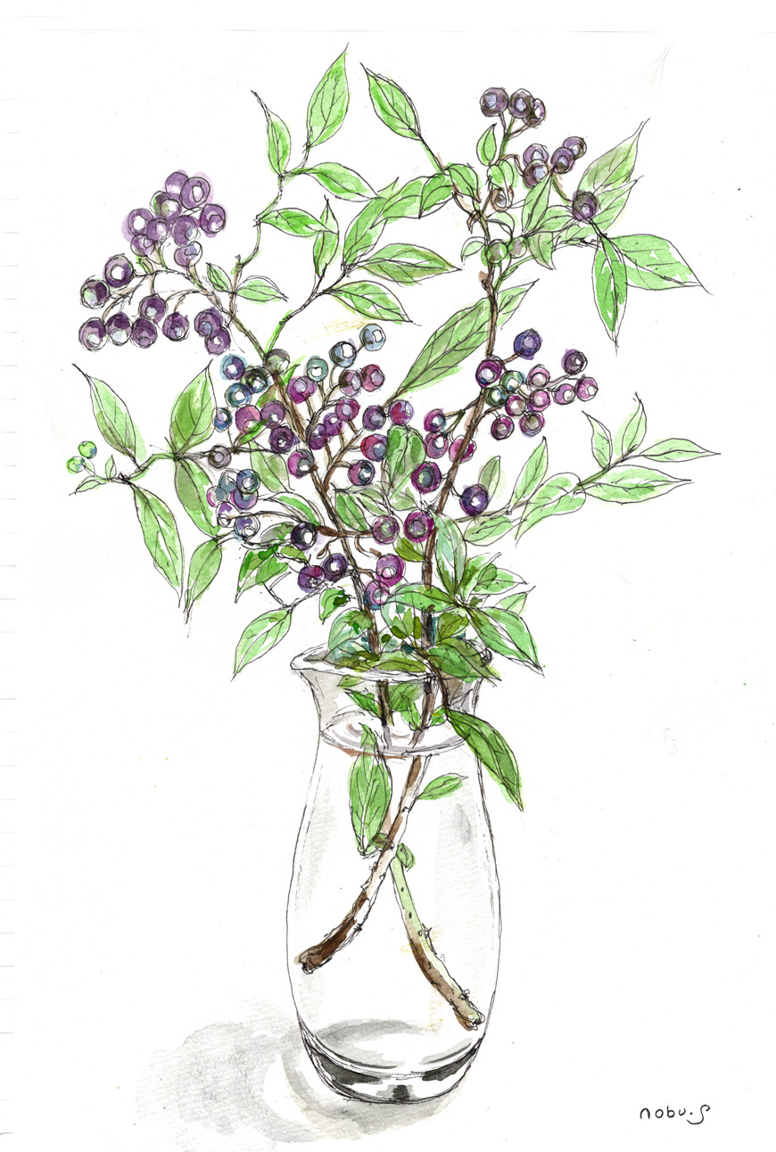 このブルーベリーを一枝買って来ました。そろそろ絵をもぐぱくにupしないとと思いペンでスルスル描きました。
