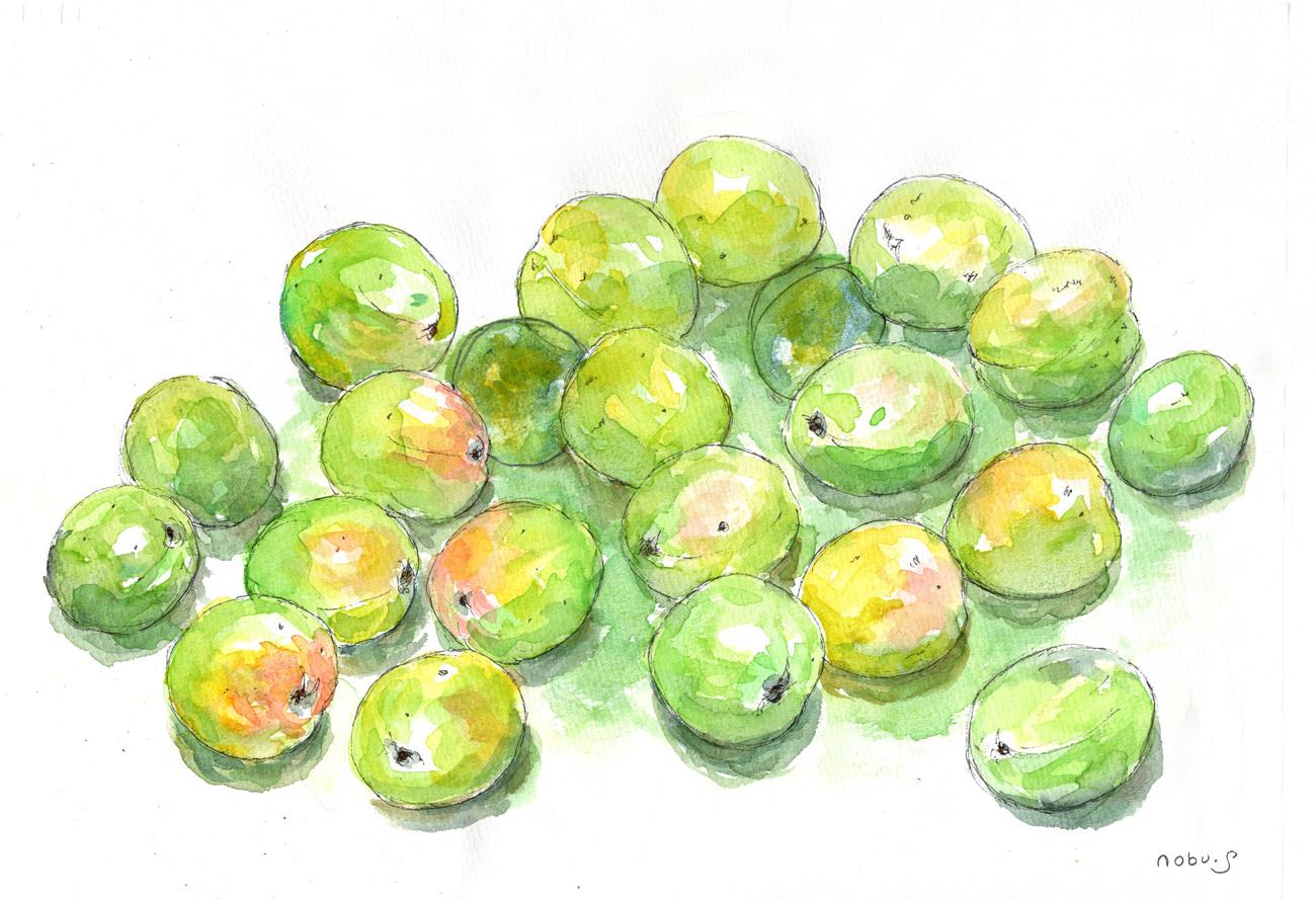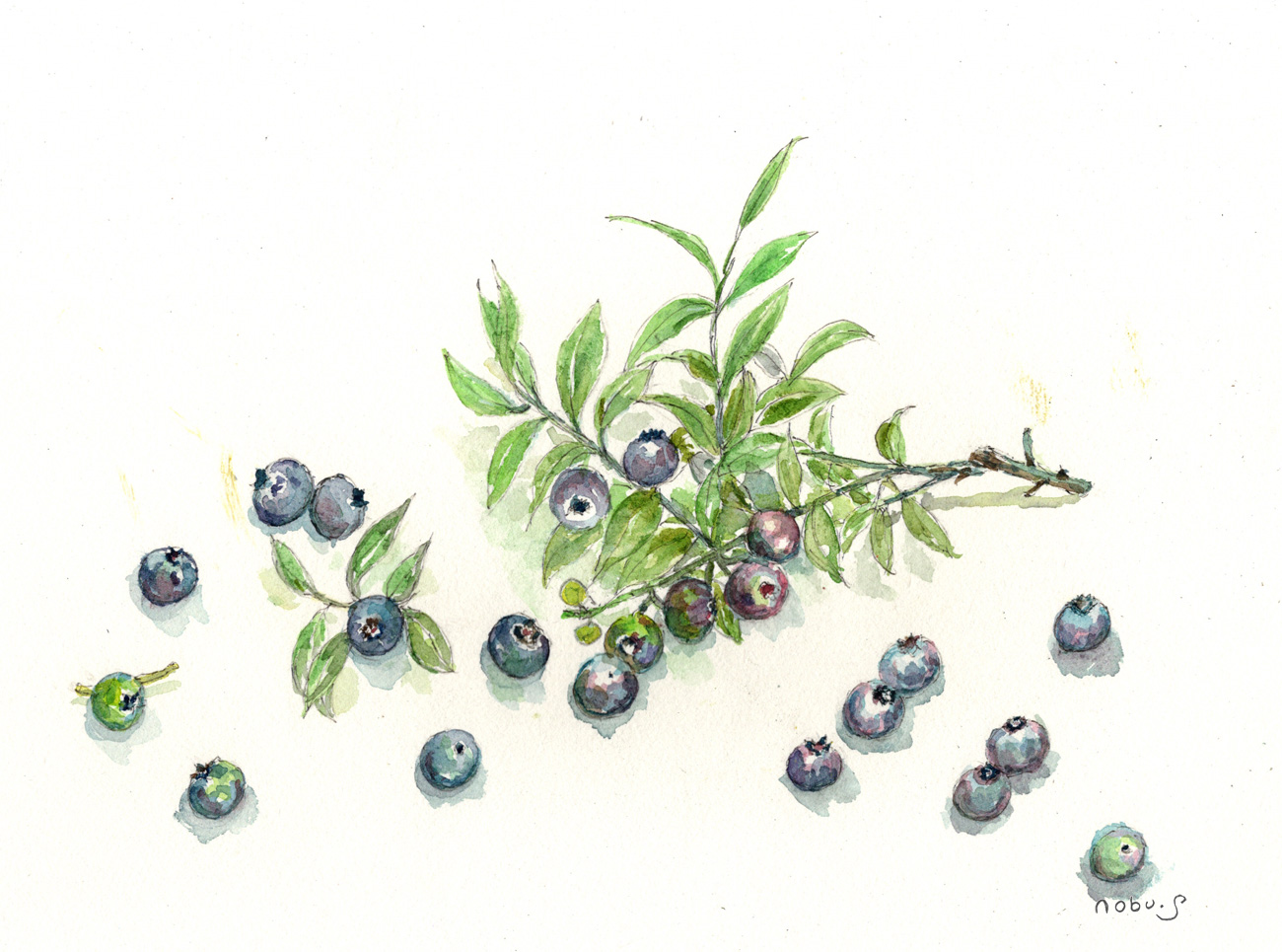 今日は家で採れたブルーベリーを描きました。今年は甘くて大きい実がなりました