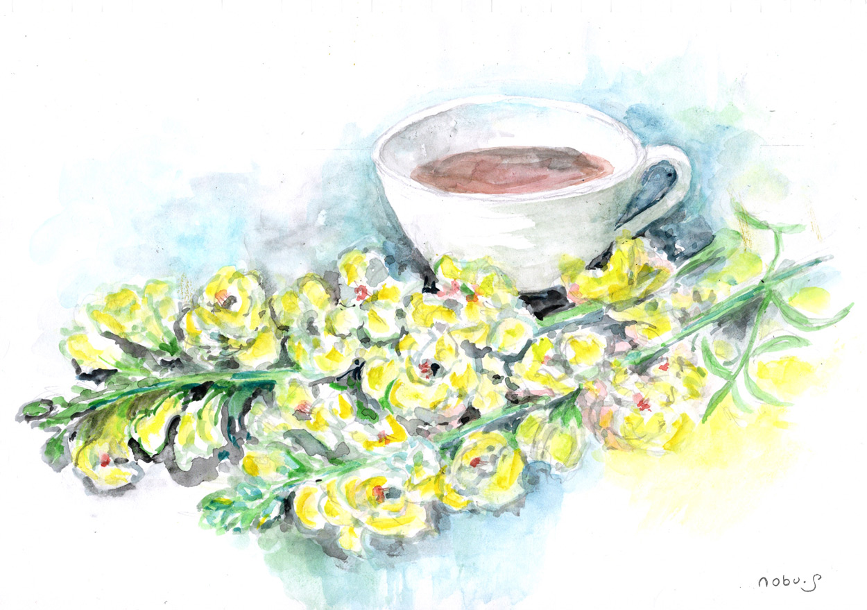 金魚草とティーカップ  (水彩画)