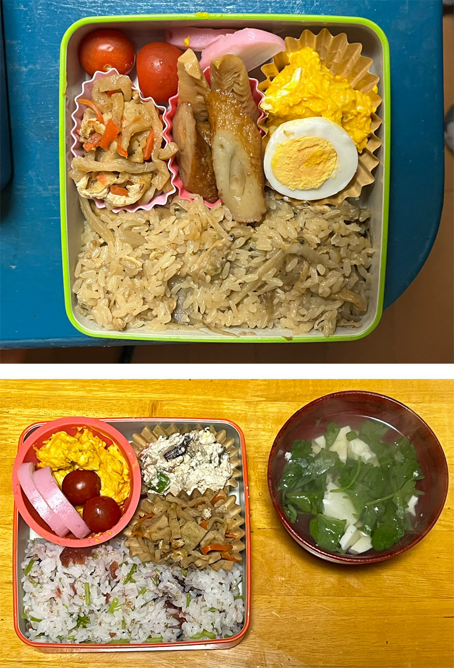 今日は梅と三つ葉の混ぜご飯にアスパラとキノコの白和え、後は昨日と同じです。今日はお吸い物も付けました(*^^*)