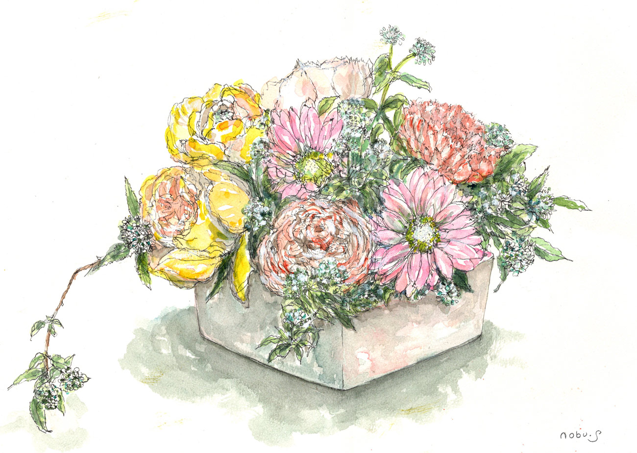 フラワーアレンジメントの絵、やっと仕上がりましたが思うようには描けませんでした。