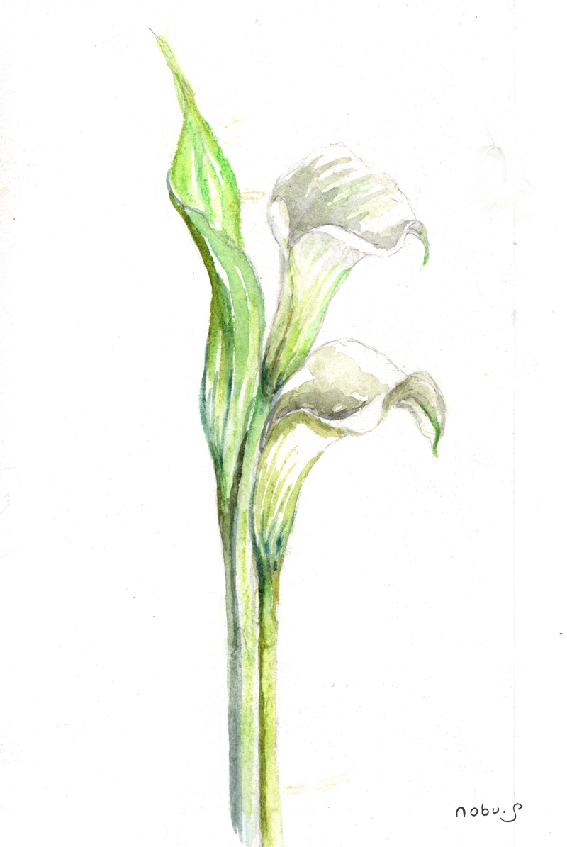 このカラーの花は娘が持って来てくれた花です。花屋さんの仕事をしているので時々素敵な花束を持って来てくれるのですが、クリスマスの花のブーケで描くのが難しい花ばかりなのでカラーだけ描きました。