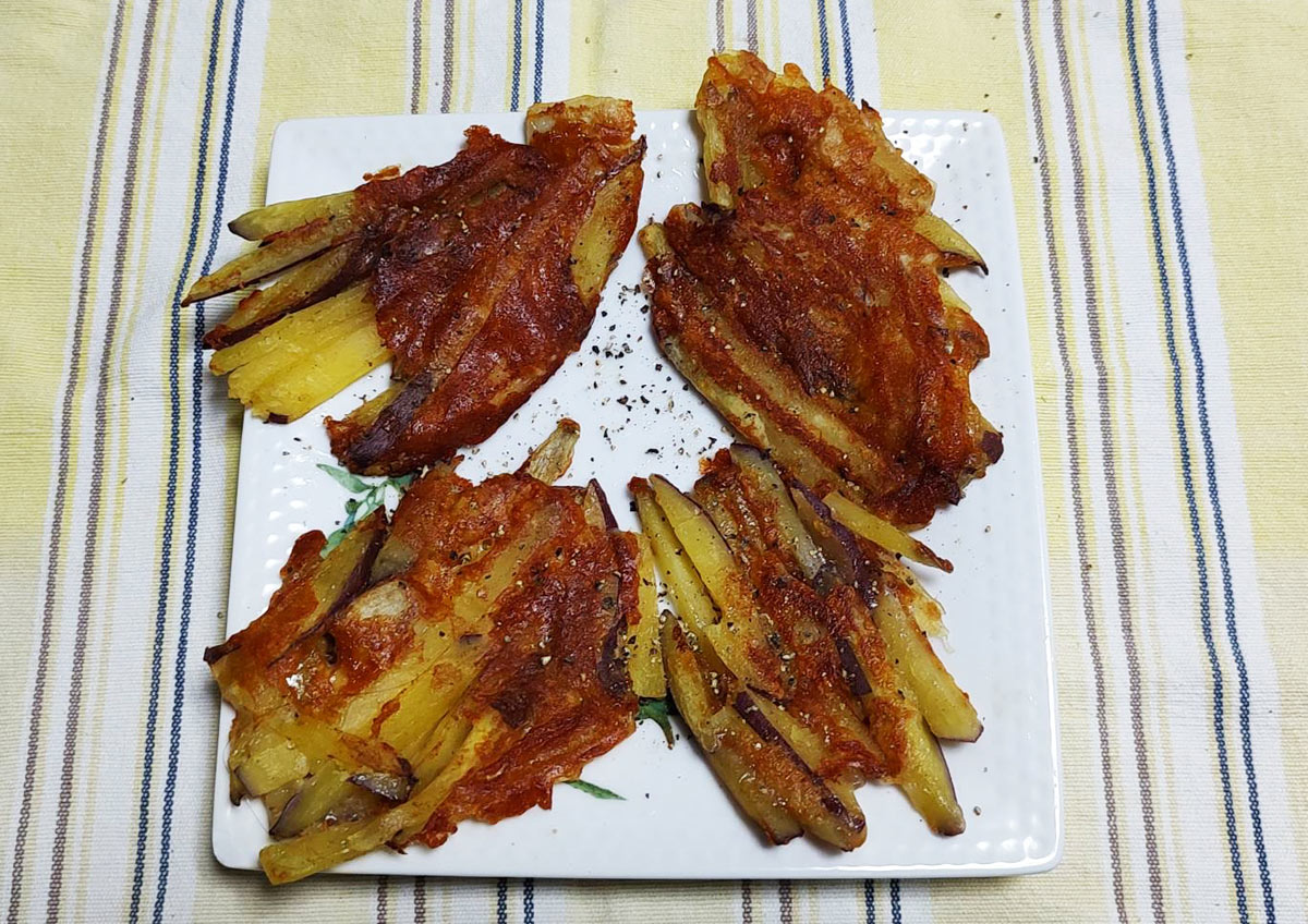 サツマイモを千切りにして蒸焼してミックスチーズをのせてカリカリに焼くだけです。皆さんも作ってみて下さいね。