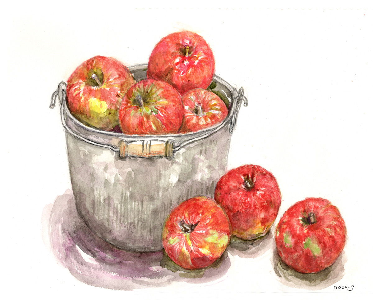 バケツと林檎〈紅玉〉  (水彩画)