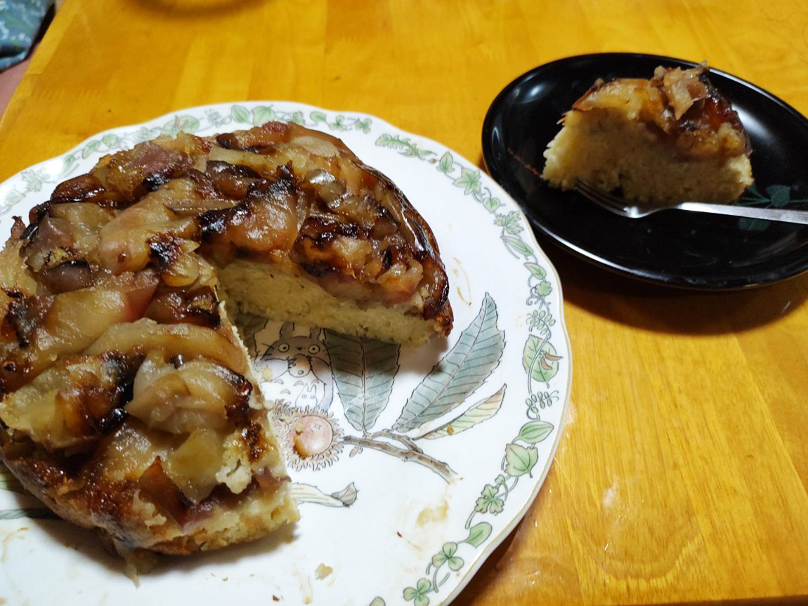 仕事から帰ってからこのケーキ焼きました。リンゴケーキの定番、タルトタタンです。リンゴ5個を1cmのいちょう切りにしてお砂糖で軽く煮てからフライパンにひきつめて卵と牛乳とホットケーキミックスを混ぜたら流し入れて蓋をして弱火で三十分位焼いたら出来上がります。