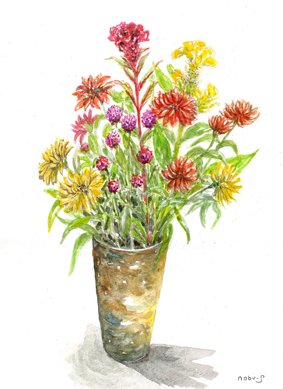 そんな訳で帰りは夕方になり、クタクタになりました。帰りにお花屋さんでかわいいブーケを見つけたので買って早速夜にかきました。夏の花ですが秋をかんじます。