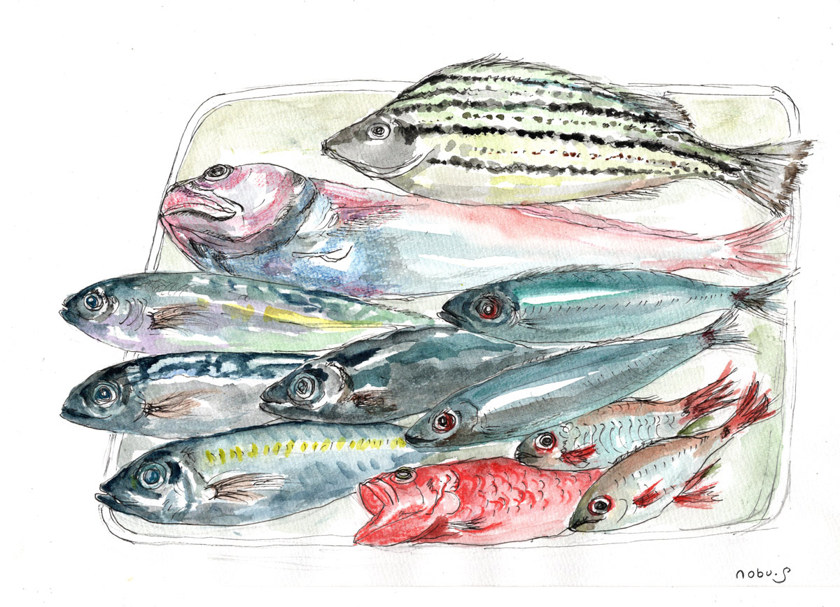 シマイサキ、ナガチゴダラ、アジ、ウルメイワシ  (水彩画)