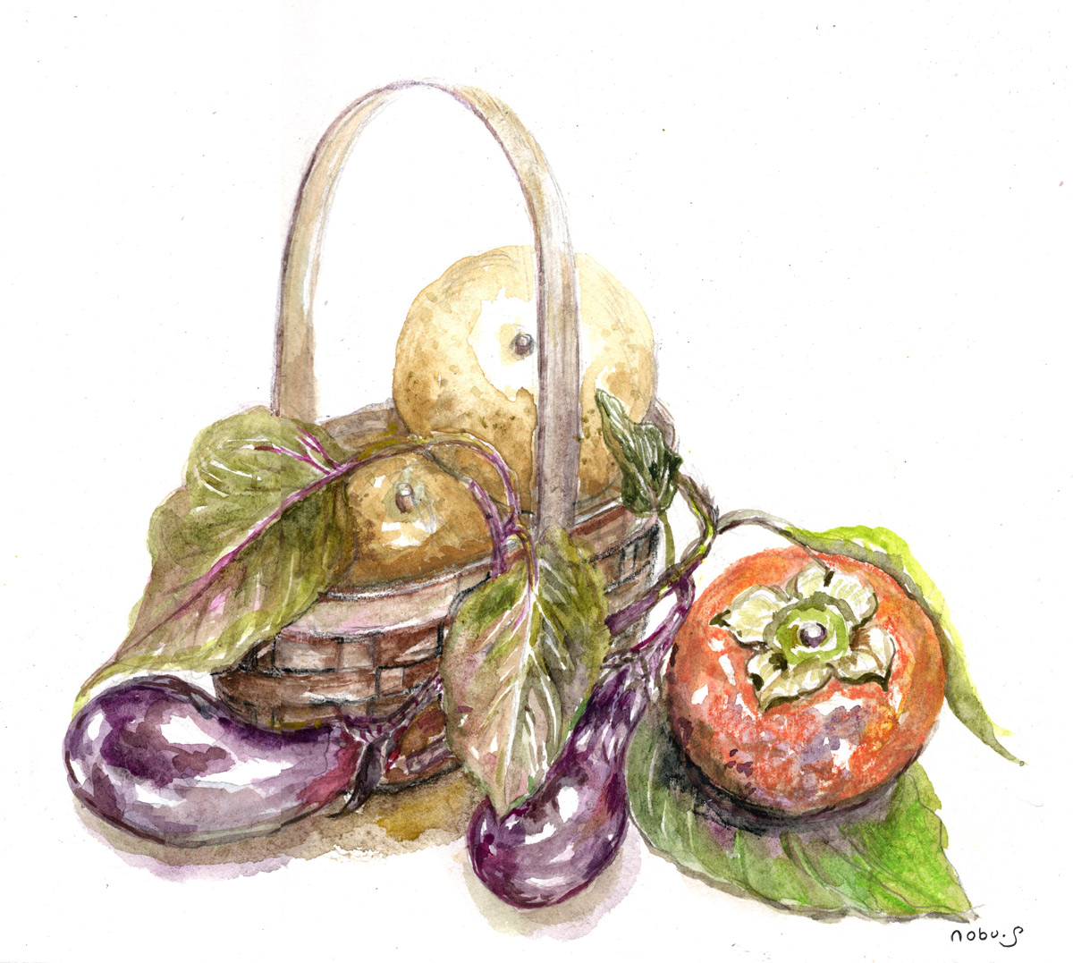 うちの茄子なので葉付きで取って描きました。あとは初物の柿と梨を籠に入れてみました。