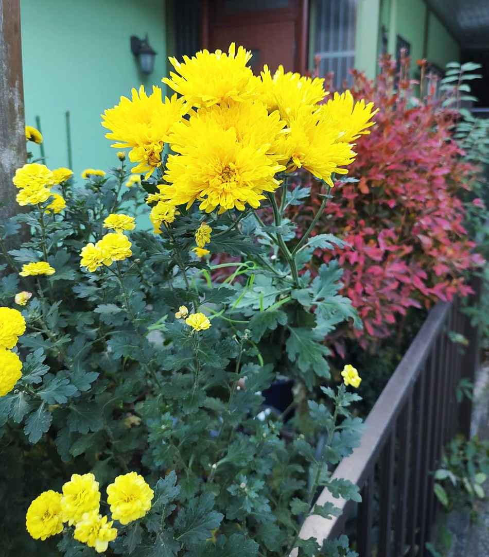 中々絵が描けないので今日は玄関先の黄色の菊と紅葉したドウダンツツジの写真です。黄色の菊は毎年良く咲いてくれて切り花に出来るので助かります。