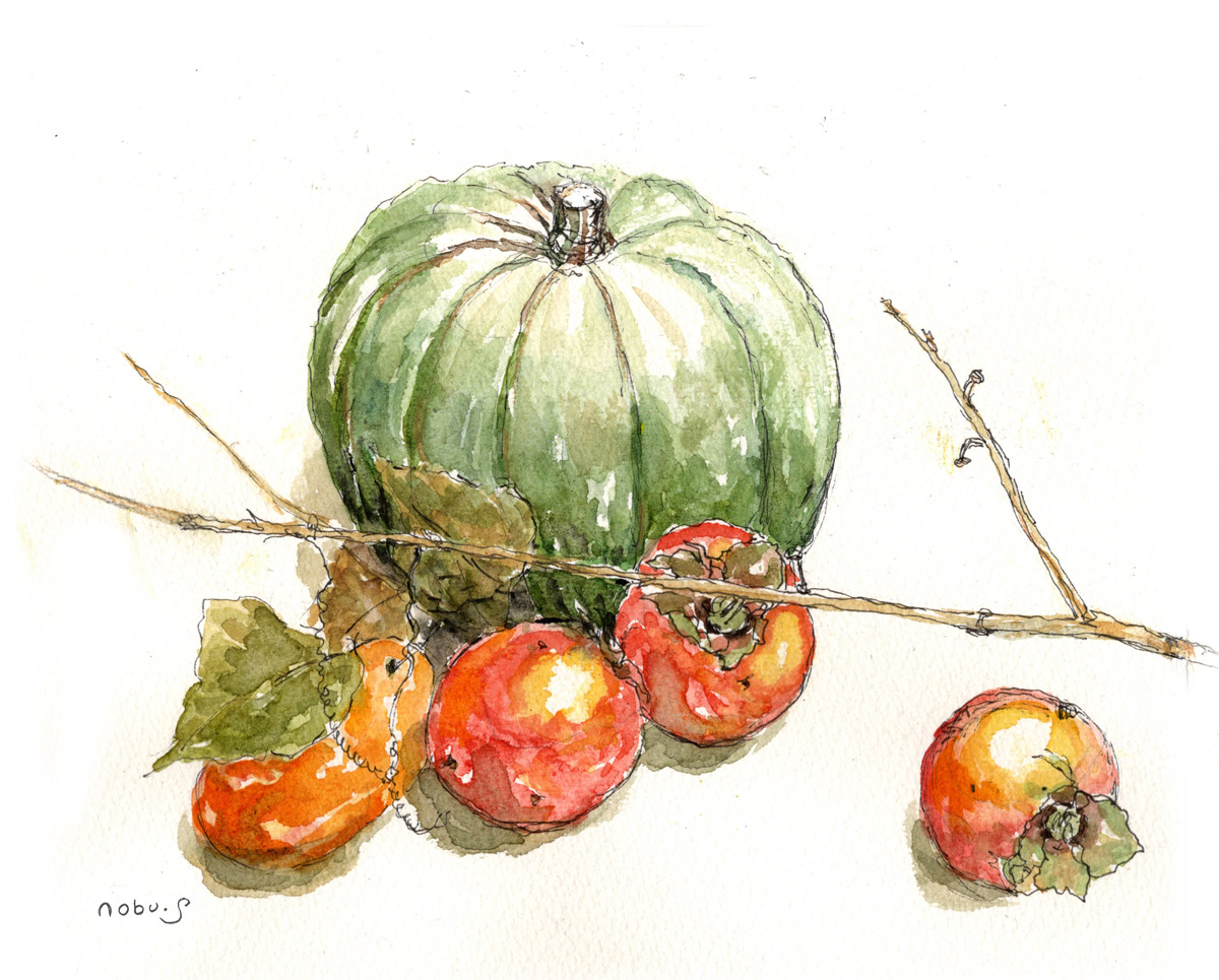 少し前に今川公園に行く途中の山の中でカラスウリを見つけて取ってきてご近所の方に貰った柿とかぼちゃを描いてみました。ペンでサラッと描いて色付けもあっさり塗りました(^^)たまにはこんな絵もいいかなっておもいます。