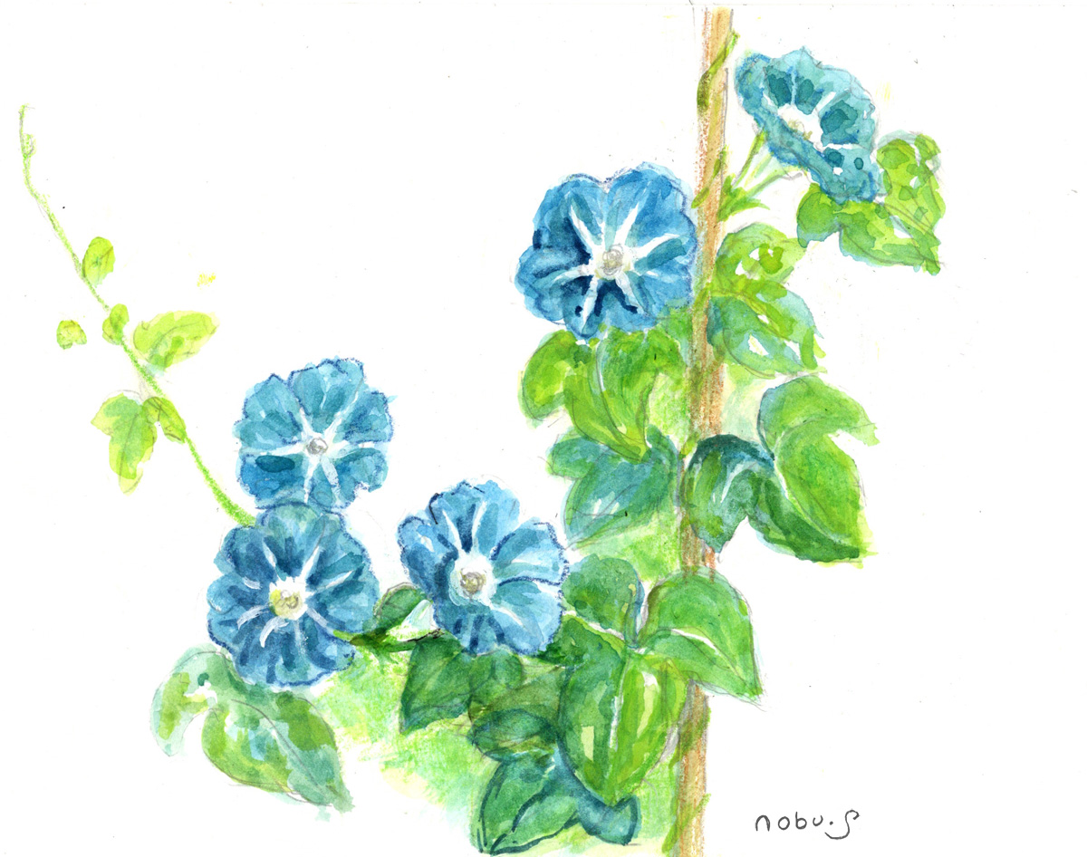 この朝顔は小さめの花で実際は水色ですが、合う絵の具がないので青色にしました。