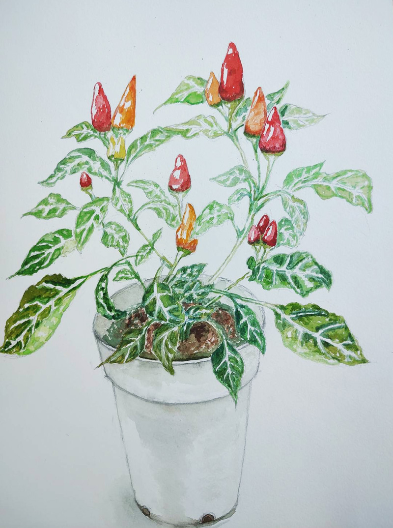 唐辛子の可愛さ、葉っぱの細かいグラデーション、鉢の立体感、素敵です。