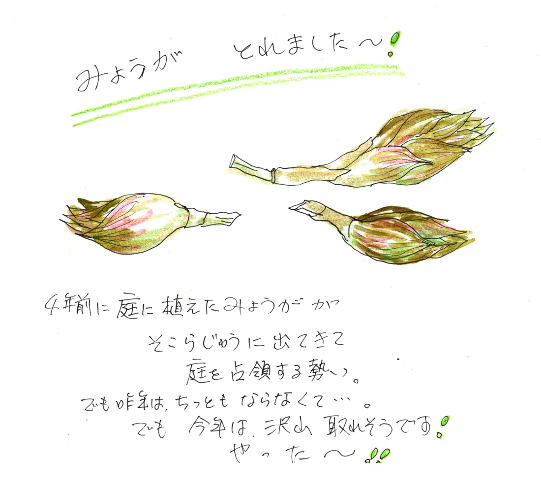 朝裏庭のみょうががなっているか草の中をもぐって探したらありました、ありました。