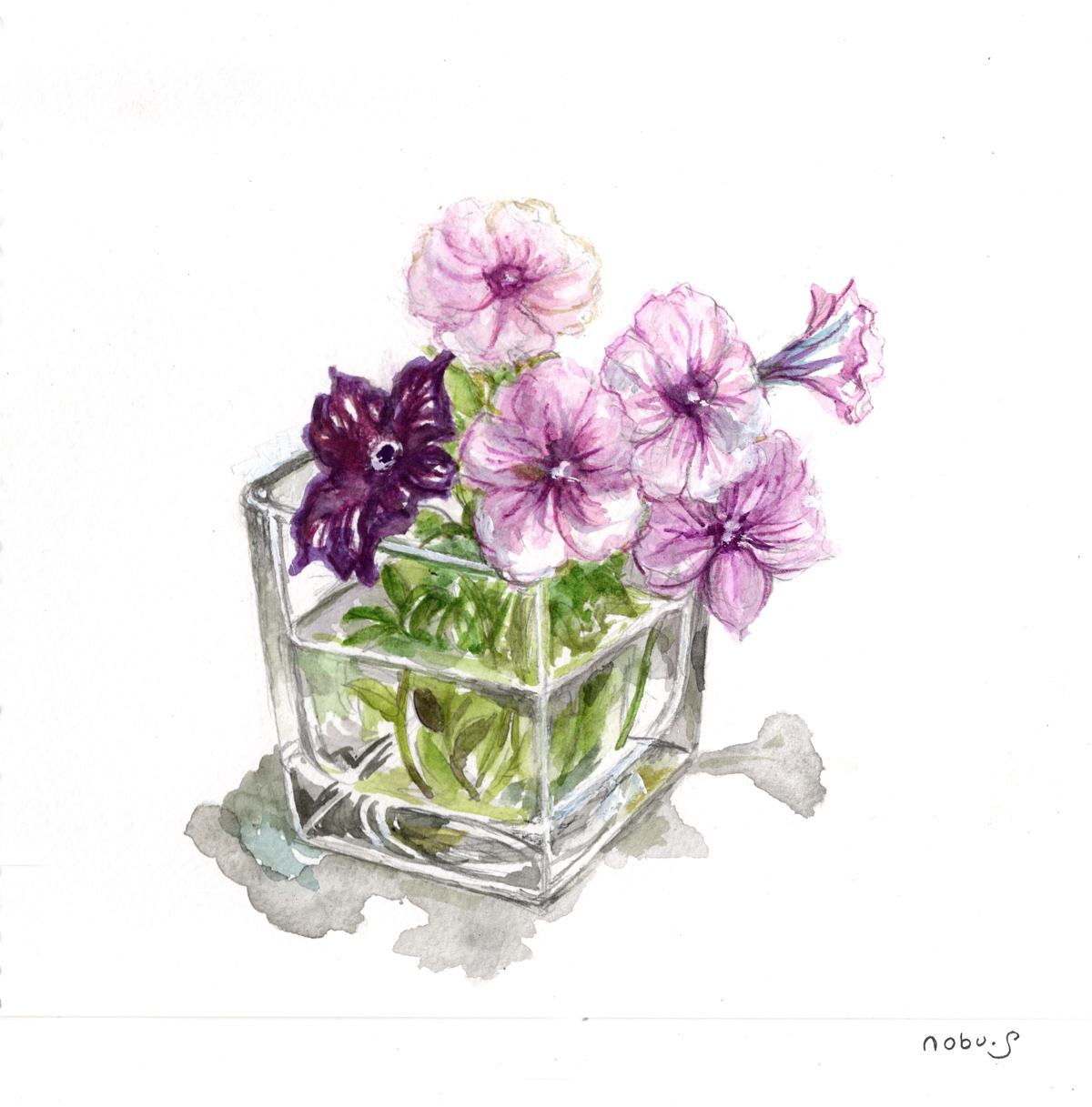 四角いガラスの入れ物に活けたペチュニア(水彩画)