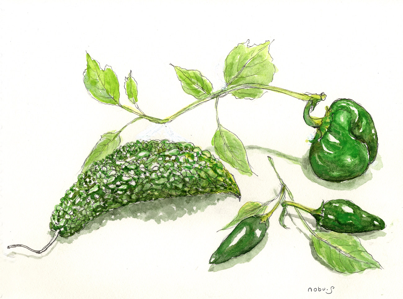 ゴーヤ、葉付きピーマンとししとう ペン画水彩