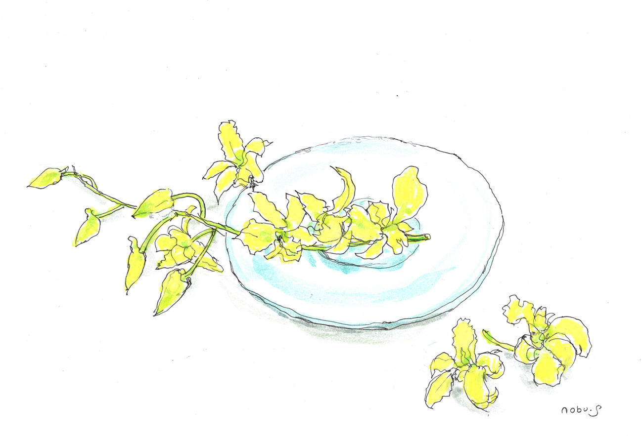今日はカラスの器に黄色のデンドロビュームを生けてむました。