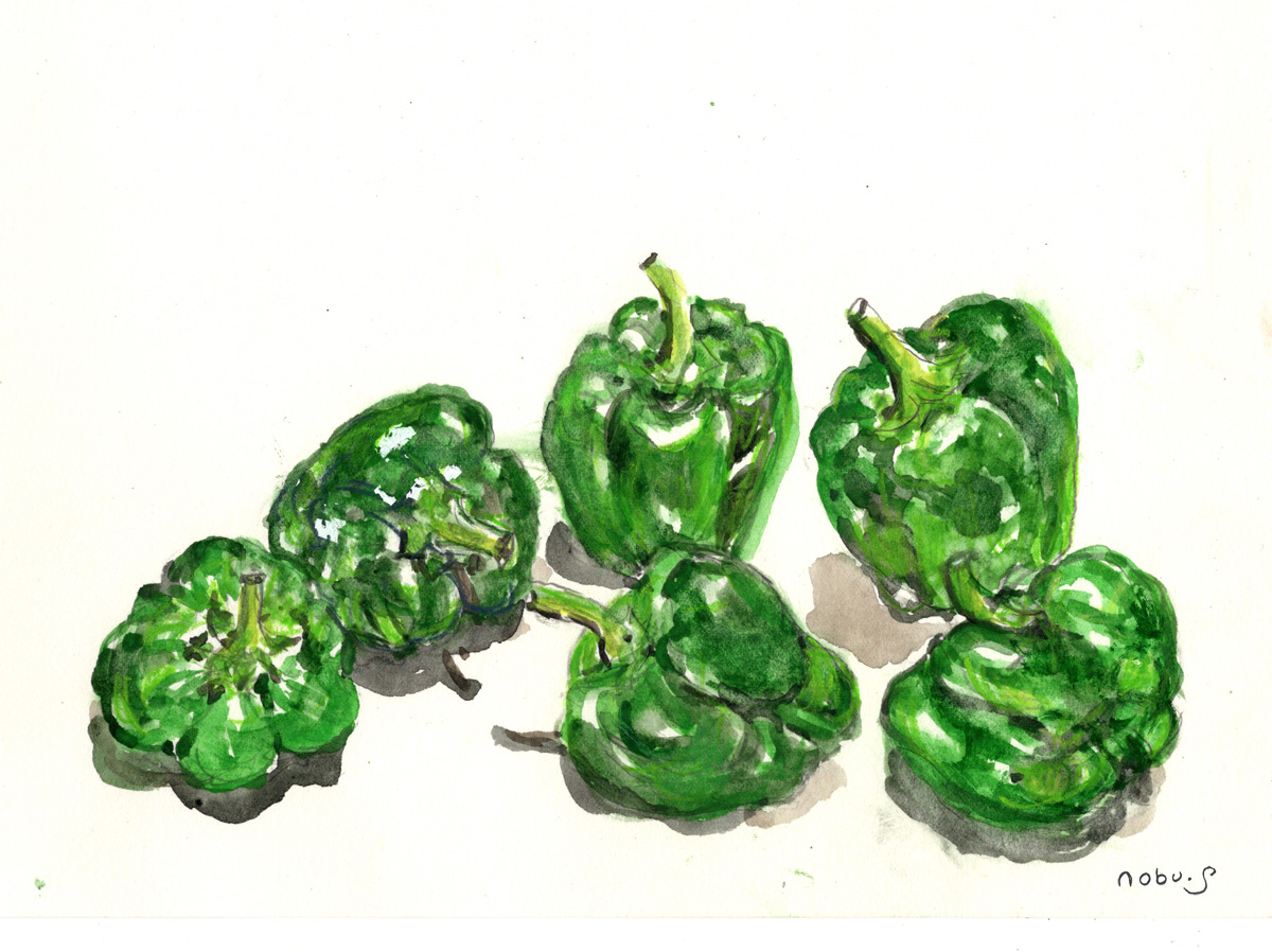 家で採れるピーマンはみんな変な形なので描き方も変えてみましたが