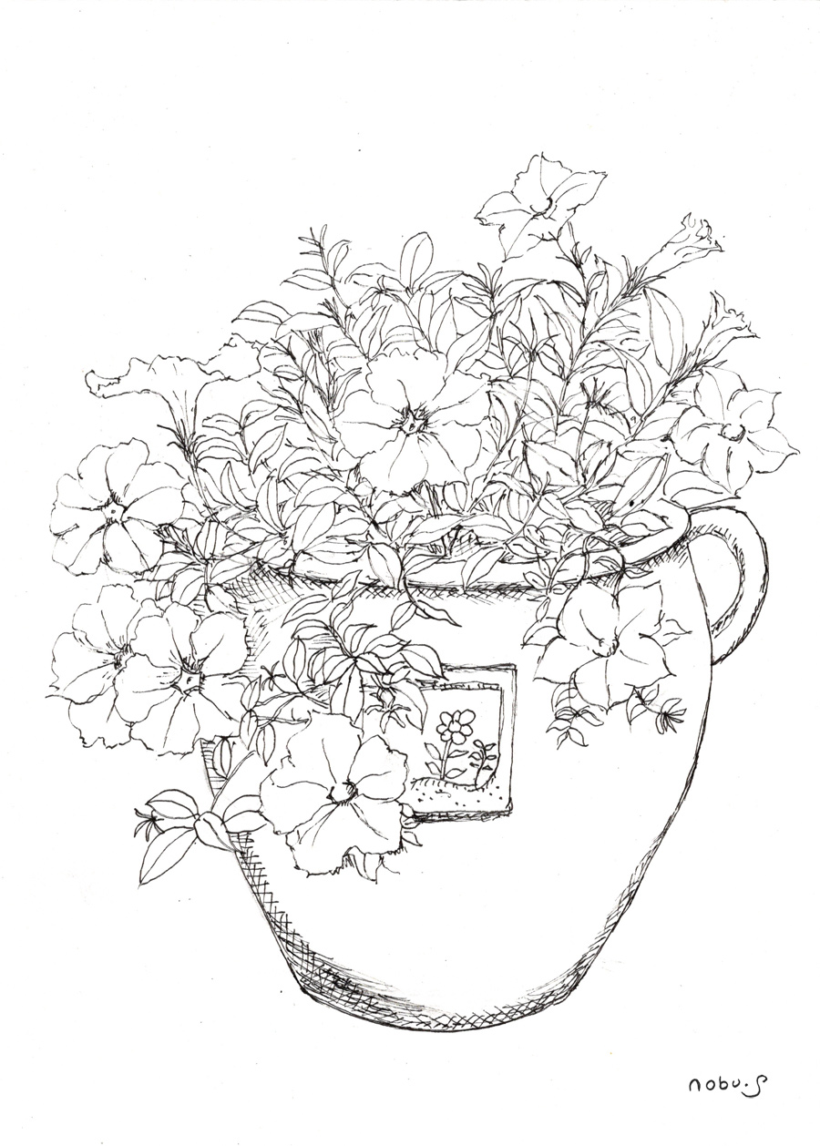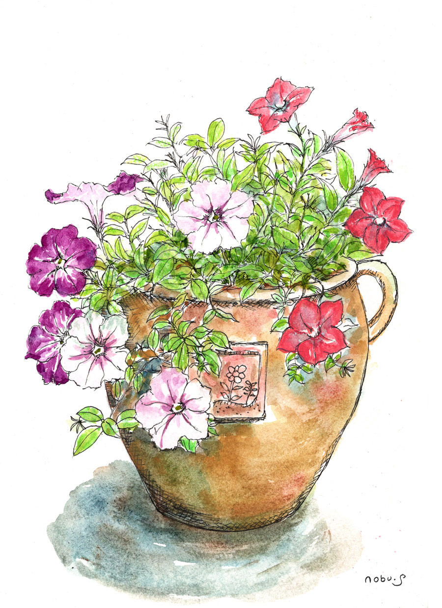 玄関先のお気に入りのポットです。3色のペチュニアの花が猛暑の中、毎日キレイに咲いてくれてます(*^^*)今日はペンでデッサンだけ描きました。