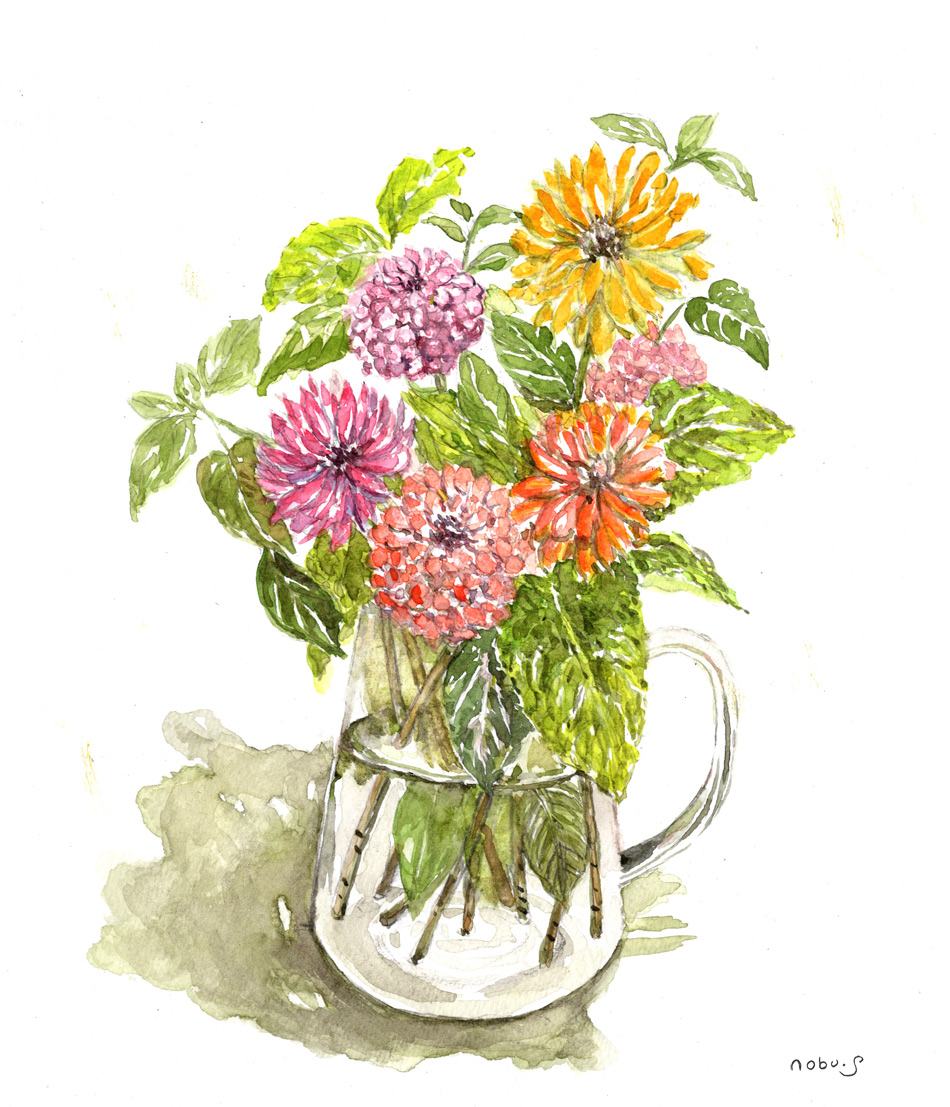 ガラスのポットに入れた百日草(水彩画)