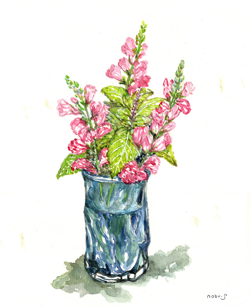 青い硝子の花瓶と金魚草 (水彩画)