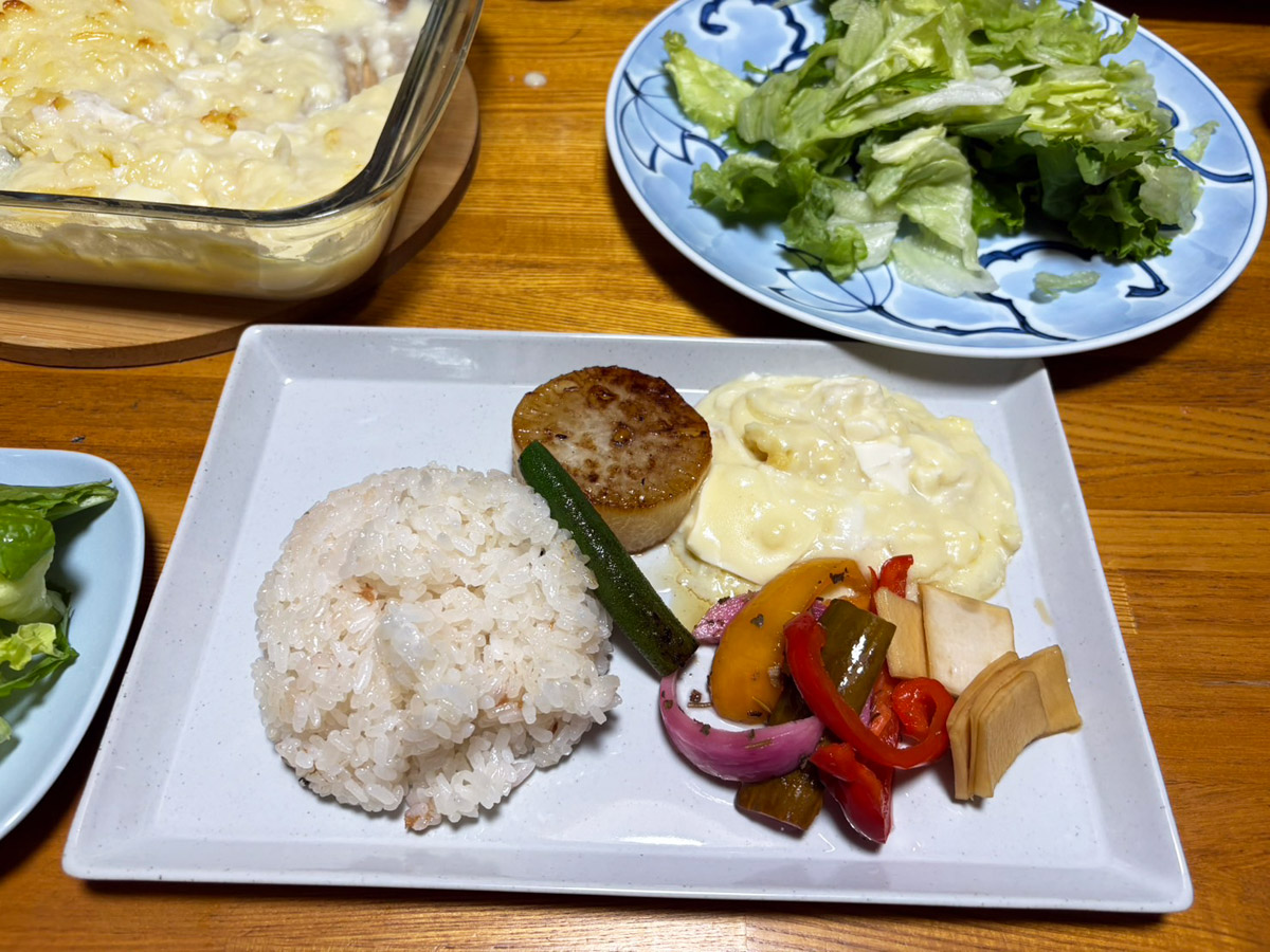 今日はランチの写真をupしました。豆腐グラタン(豆乳のホワイトソース)梅ご飯、大根のステーキ、ピクルス、グリーンサラダです。ヘルシーメニューです(^o^)