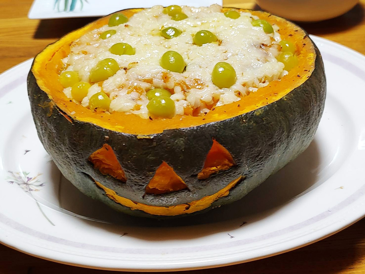 前回来た生徒さんが大きなかぼちゃをお絵描きのモチーフで飾っていたら丸ごとのかぼちゃのグラタンが食べてみたいと言うので頑張って作りました\(^o^)/